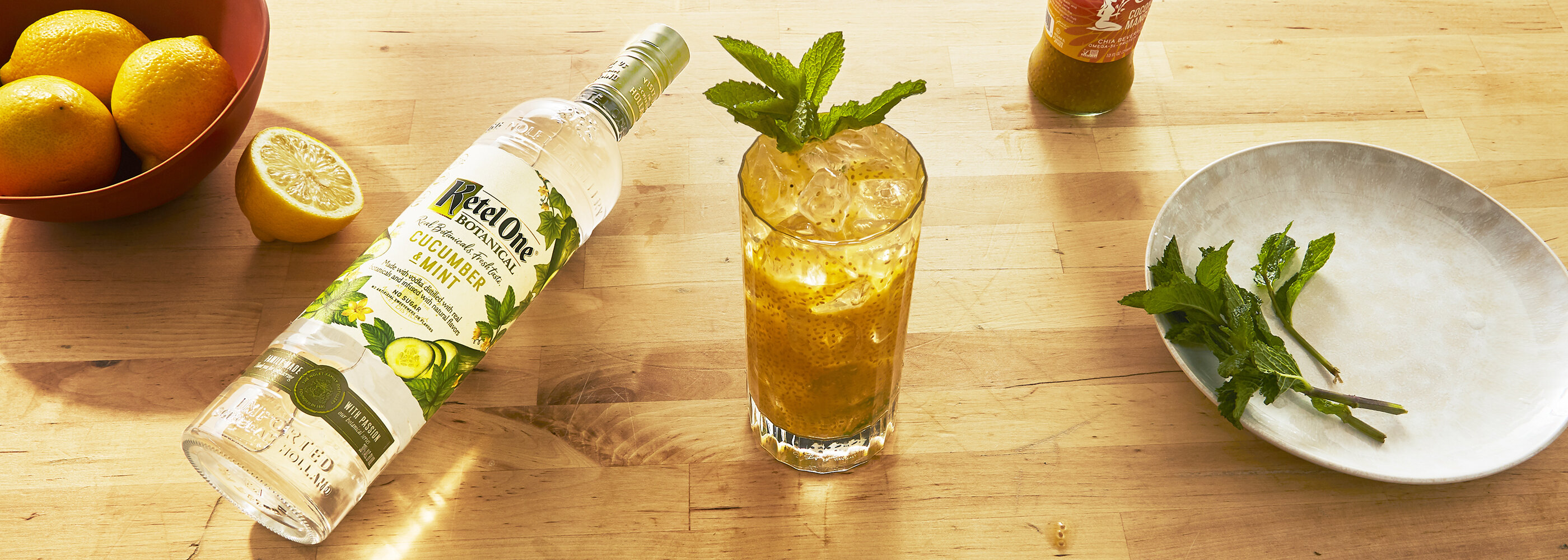 Pour cucumber mint lemonade over a glass of ice with 2 ounces of Ketel One Botanical Cucumber.
